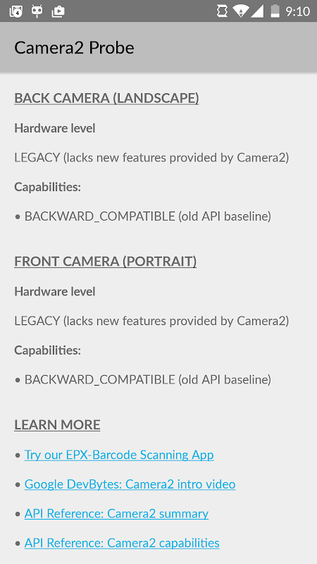 Dalam Android 5.0 Lollipop, Google dikemaskini API Kamera. Tetapi, hanya kerana peranti anda boleh menjalankan Android Lollipop atau Marshmallow, tidak bermakna bahawa kamera peranti anda menyokong fungsi penuh. Aplikasi ini memberikan jawapannya: "apa ciri-ciri API Kamera2 itu yang disokong kamera saya"