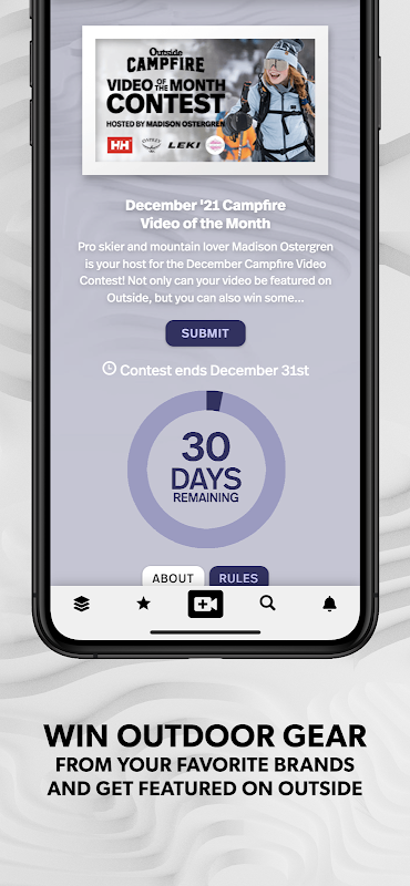 Muat naik dan kongsi video pengembaraan anda sendiri di mana anda boleh menyertai peraduan api unggun bulanan untuk memenangi peralatan luar daripada jenama luar kegemaran anda.