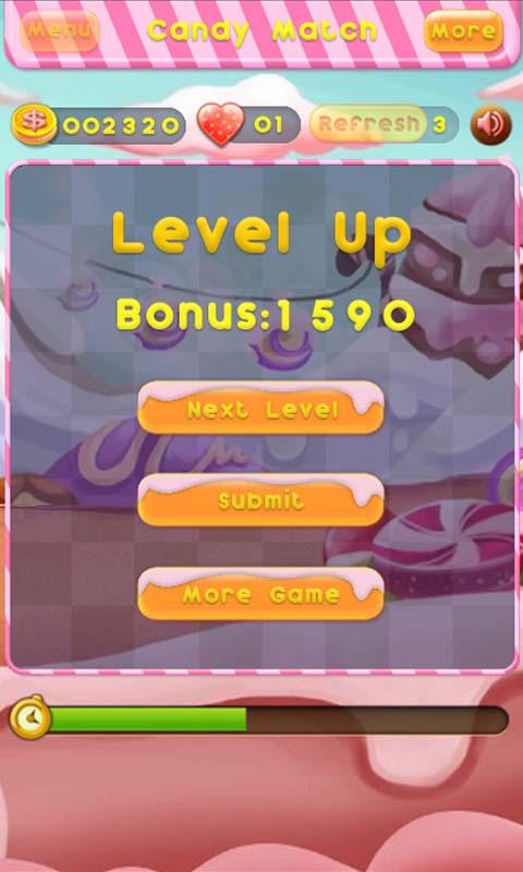 Your mission is to Match three or more same candies to collect them.Match the candies until the board opaque to level up in limit time.