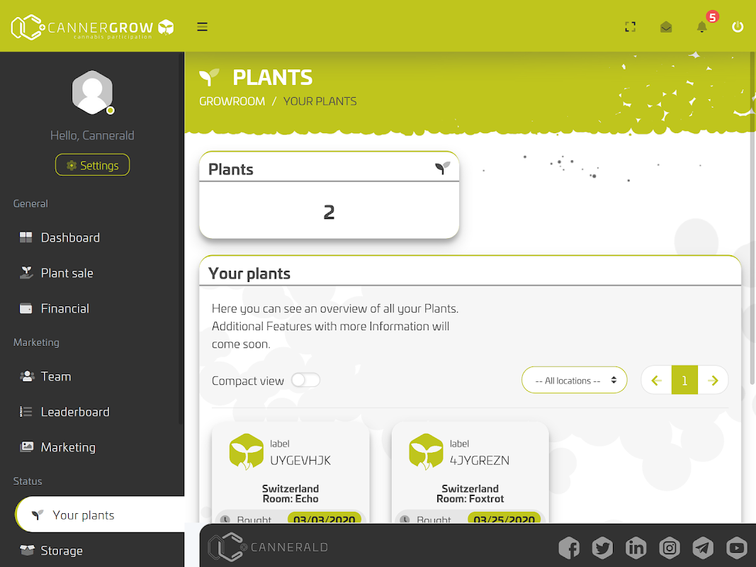 Cannergrow adalah projek yang diasaskan oleh Cannerald yang menggabungkan pemupukan profesional dengan antara muka Pelanggan-Akhir-Web yang mudah digunakan. Kami menawarkan Perkhidmatan Penanaman Tumbuhan yang pertama dan setakat ini di seluruh industri Ganja. Sesiapa sahaja dari seluruh dunia boleh memulakan industri ganja dengan kami menjadi penanam maya dan mendapatkan pasaran bernilai milyaran dolar ini. Kami mengutamakan kualiti tertinggi untuk memuaskan pelanggan kami. Untuk dapat memastikan tahap kepuasan ini, kami benar-benar mematuhi standard kualiti Swiss sambil menetapkan standard baru dalam industri ganja.
