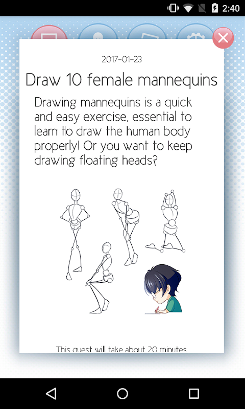 Jika anda sama ada ilustrator, artis komik, artis manga atau anda hanya mahu memperbaiki lukisan anda, mengambil masa setengah jam sehari dan biarkan kanvas Tutor membimbing anda dengan usaha hariannya.