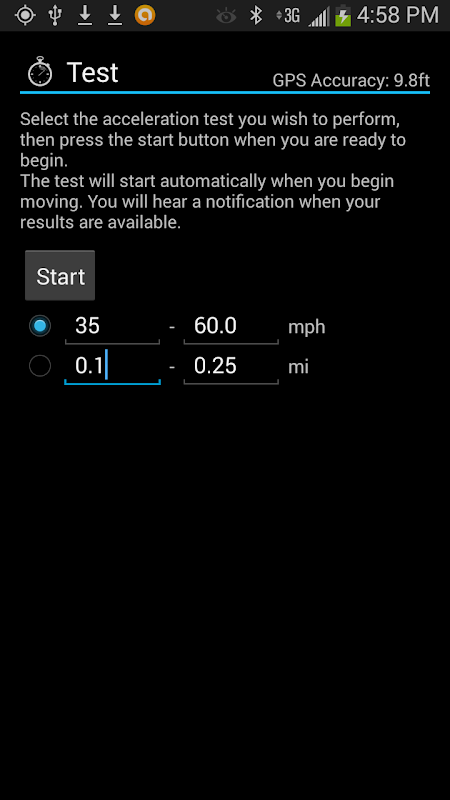 - Define your own test: record your acceleration up to your desired speed or distance.