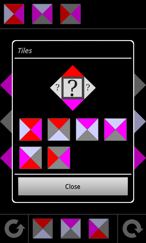 Car[ré] - [cou]leur (Square - color) is a puzzle game based on colored square tiles to place on a board. The square shape and the colors increase the difficulty of the puzzle compare to a regular puzzle based on piece without regular shape and colors.