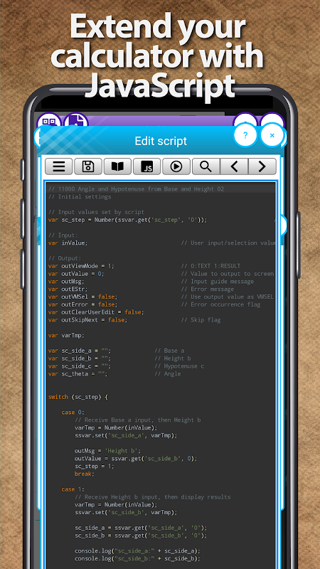 * Dilengkapi dengan fungsi pelaksanaan program JavaScript ciptaan pengguna yang melebihi kefahaman apl kalkulator.