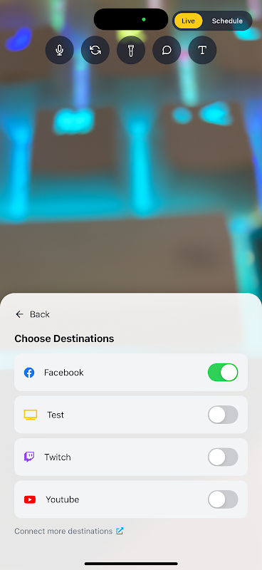 Castream memungkinkan Anda melakukan live streaming ke YouTube, Twitch, Halaman Facebook, Instagram Live, TikTok Live, dan tujuan RTMP apa pun — semuanya langsung dari ponsel Anda.