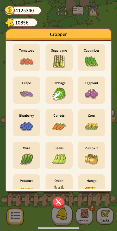 Menanam sayur di ladang sayur, Jaga pertumbuhan sayur dengan sabar, Menunggu sayur matang dan menuai, Memetik sayur dan menjual kepada haiwan.