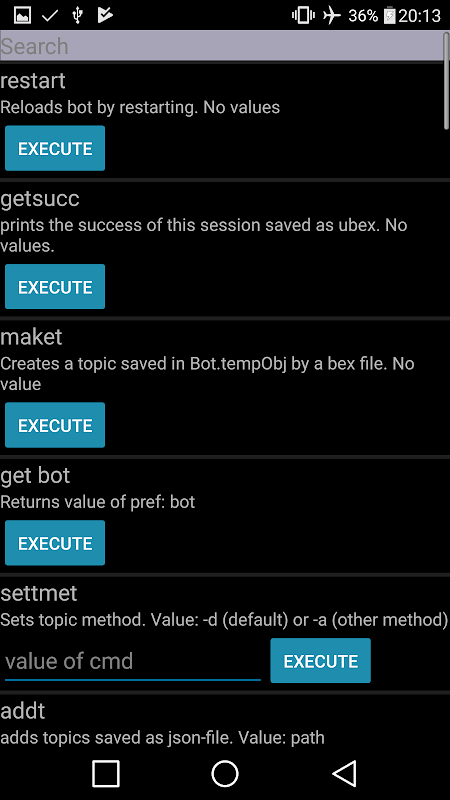 - import [nama]: import sebelum dieksport fail '.ubex' disimpan dalam '/ sdcard / Lurzapps / EasyBot / eksport'