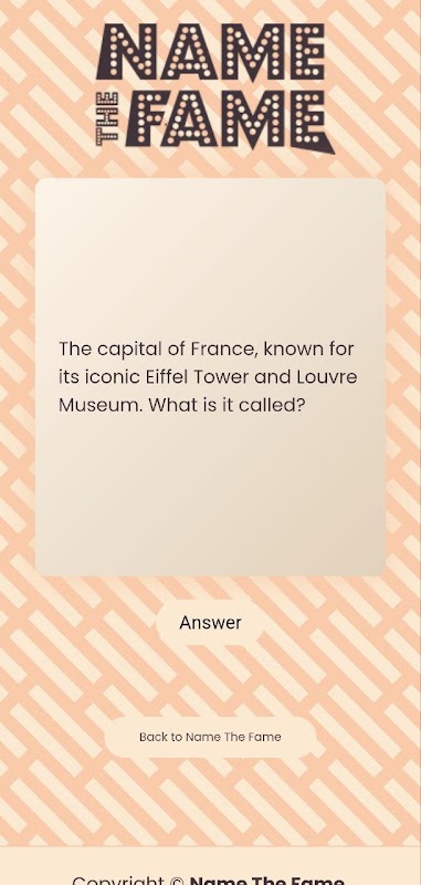 Name the Fame ialah permainan trivia yang canggih dan direka dengan teliti yang akan menguji pengetahuan dan kepakaran anda. Selami dunia orang terkenal, tempat ikonik, watak terkenal, simbol popular dan negara terkenal sambil anda merungkai penerangan yang menarik dan memulakan usaha untuk mengenal pasti dan menamakan entiti yang terkenal ini.