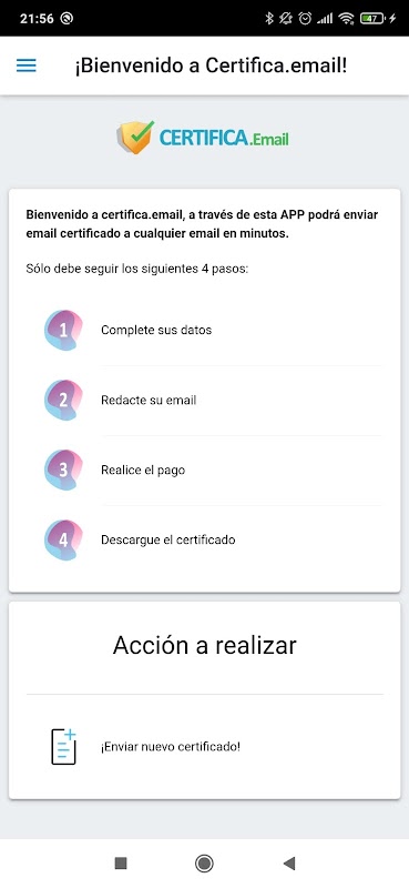 Esta aplicación le permite utilizar los servicios de "certifica.email" para enviar comunicaciones certificadas por email. La aplicación requiere la compra de saldo para poder ser usada.
