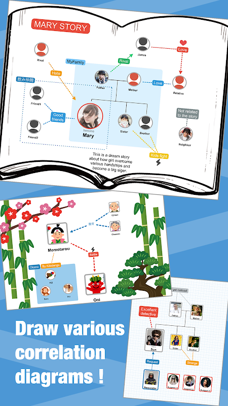 Anda boleh membuat rajah hubungan watak dengan mudah (Pokok keluarga, dll)