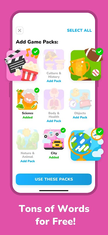 - 10 kategori Percuma: Akses kesemua 10 kategori perkataan secara percuma, termasuk Jenama, Sukan dan Haiwan.