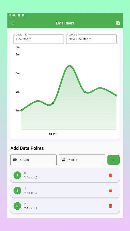 Pembuat Carta - Bina Graf ialah aplikasi berkuasa namun mesra pengguna yang direka untuk membantu anda mencipta carta yang cantik dan profesional dengan mudah. Sama ada anda sedang membuat pembentangan, laporan atau hanya perlu memvisualisasikan data dengan cepat, apl ini telah membantu anda. Buat graf Line, Bar, Donut, Scatter dan Radar yang menakjubkan, sesuaikan graf tersebut agar sesuai dengan gaya anda dan paparkan data dengan cara yang menarik dan bermaklumat.