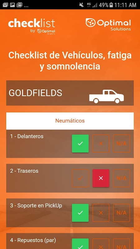 Senarai semak adalah aplikasi sokongan untuk perusahaan, yang dibuat dan dapat digunakan untuk memenuhi persyaratan dan meninjau operasi kendaraan dan dukungan dalam memperoleh pengetahuan mengenai langkah-langkah keselamatan. Aplikasi ini membolehkan anda menolak senarai semak, yang membolehkan anda memasukkan komen, nota suara, foto atau video untuk menyimpan bukti. Pengoperasian alat ini mudah dan berkesan untuk syarikat. Untuk menggunakan aplikasi, syarikat mesti menandatangani kontrak dengan Optimal Solutions dan memasukkan kenderaan dan kuesioner mengikut jenis kenderaan. Pengguna hanya perlu didaftarkan terlebih dahulu oleh syarikat yang meminta. Oleh itu memberikan gambaran yang sangat cepat mengenai status kenderaan dan pengumpulan pengetahuan. Akibatnya, kami menemukan peningkatan baik dalam penyemakan dan pembaikan kenderaan dan dalam kecekapan dan pengoptimuman beberapa proses syarikat.