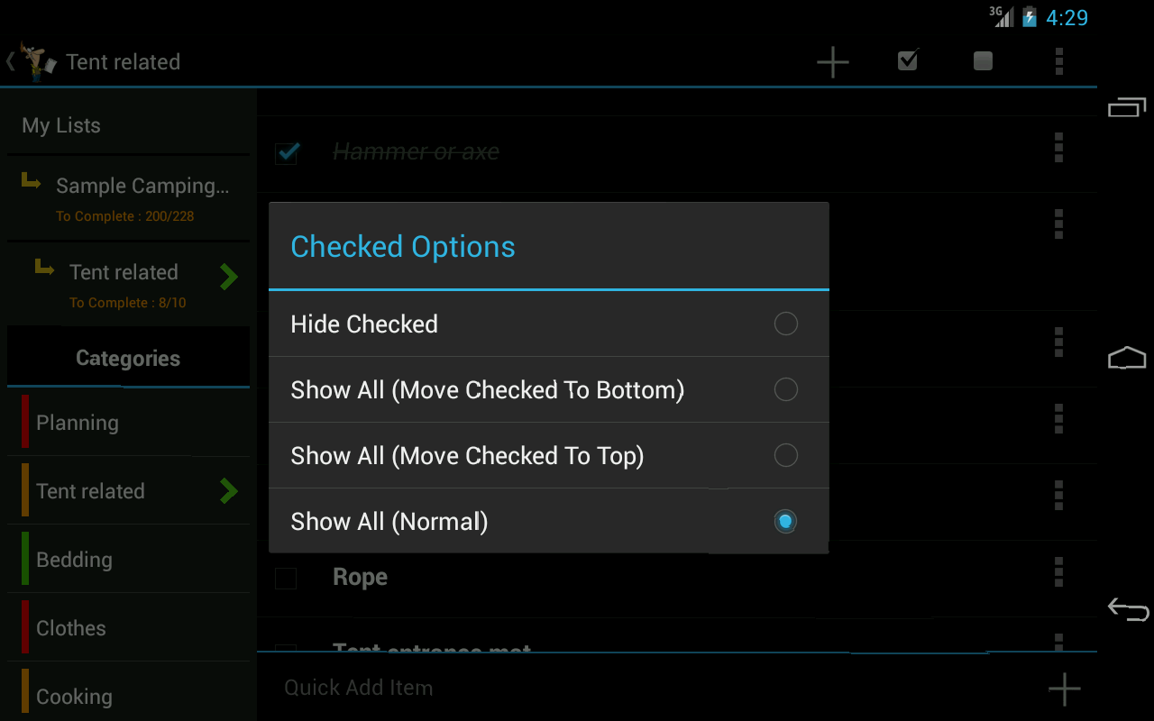 This app is a simple checklist for your everyday needs. Very simple and intuitive to use.