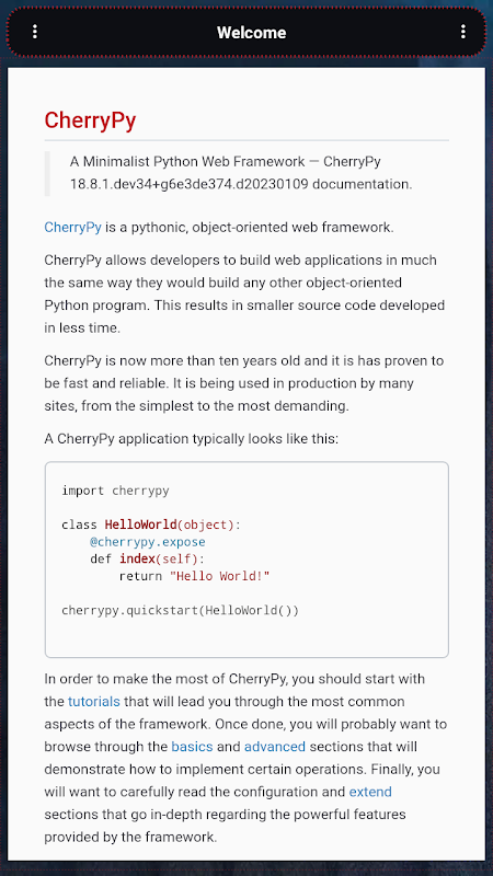 Aplikasi ini akan membolehkan anda mempelajari CherryPy dari awal hingga akhir, di luar talian secara percuma. Anda juga boleh mengaktifkan edisi penuh untuk dapat menyusun kod python juga dalam apl anda, serta mengakses ciri lain.