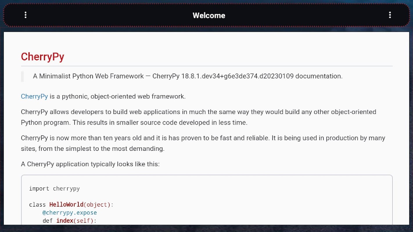 CherryPy adalah antara rangka kerja web tertua, paling mudah dan diselenggara dengan baik yang tersedia untuk Python. CherryPy mempunyai antara muka yang bersih dan melakukan yang terbaik untuk mengelakkan diri anda sambil menyediakan perancah yang boleh dipercayai untuk anda bina.