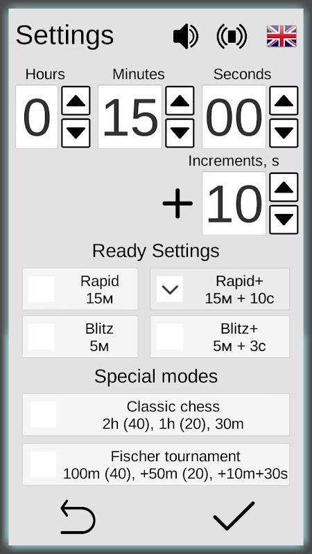 Jam Catur Catur - jam sejagat untuk permainan catur dan catur. Kawalan masa dengan kenaikan disokong.