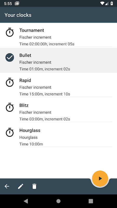 Use variety of predefined chess clocks and timers or easily create your own.