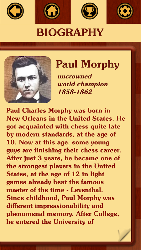You have to study 50 commented games of chess legend-Paul Morphy. In each game, there will be tasks where it is necessary to find a move or the whole variation of the great Maestro, "to play like Morphy".