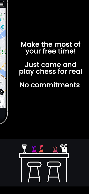Apl ChessBar membantu anda mencari dan menyertai pertemuan catur kehidupan sebenar yang mesra di bar, kafe dan tempat selesa lain berhampiran anda, semuanya secara percuma.