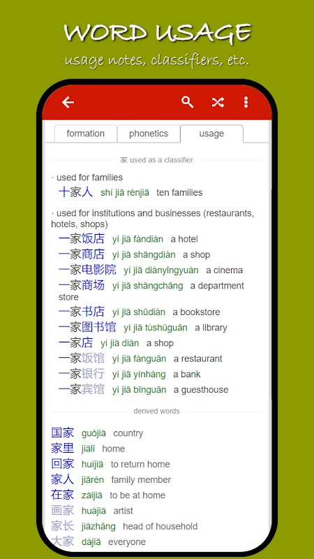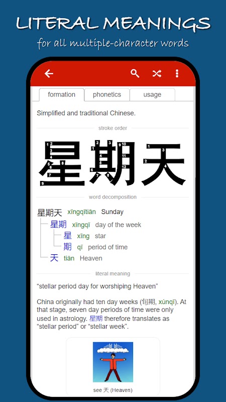 Apl ini secara unik menyahbina aksara dan perkataan Cina hingga kepada komponen termudahnya, menyediakan pautan yang jelas antara setiap komponen, dengan bantuan memori disediakan untuk setiap perkataan dan aksara.