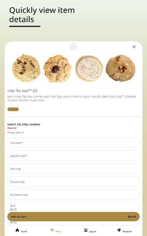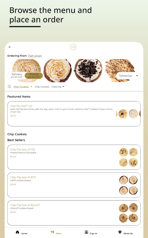 Gunakan apl Kuki Cip untuk mencari lokasi terdekat anda, lihat menu kami dan buat pesanan. Jimat masa dengan memesan lebih awal. Peroleh mata kesetiaan dan jejak status ganjaran anda dari dalam apl. Mengidam biskut? Pesan Kuki Cip yang baru dibakar dalam talian untuk penghantaran cepat atau pengambilan mudah. Kebaikan hangat dan melekit hanya dengan beberapa klik sahaja.
