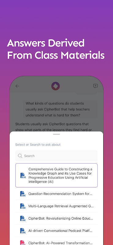 Cipherbot ialah apl berkuasa AI yang membantu anda memanfaatkan sepenuhnya kelas anda. Hanya tanya soalan dan Cipherbot memberi anda jawapan yang jelas dan tepat berdasarkan bahan yang telah dimuat naik oleh guru anda. Ia seperti berbual dengan kursus anda — bila-bila masa, di mana-mana sahaja.