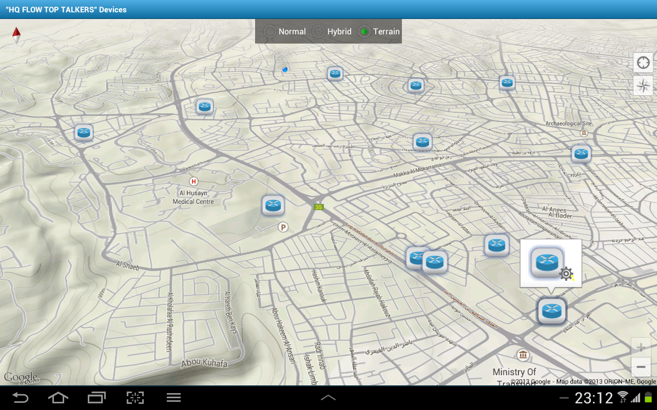 The popup bubble for each of the defined Router devices includes a "Settings" icon which links the user to the device's credentials which the user needs to fill-in as per the actual router configuration.