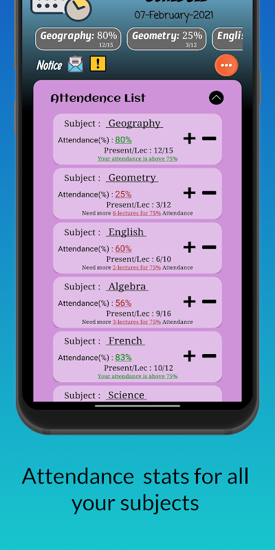 • Users can maintain their attendance by clicking the plus icon for the specific subject each day, which will be updated in the attendance list with attendance percentage and the total number of lectures attended out of the total number of lectures up to date.