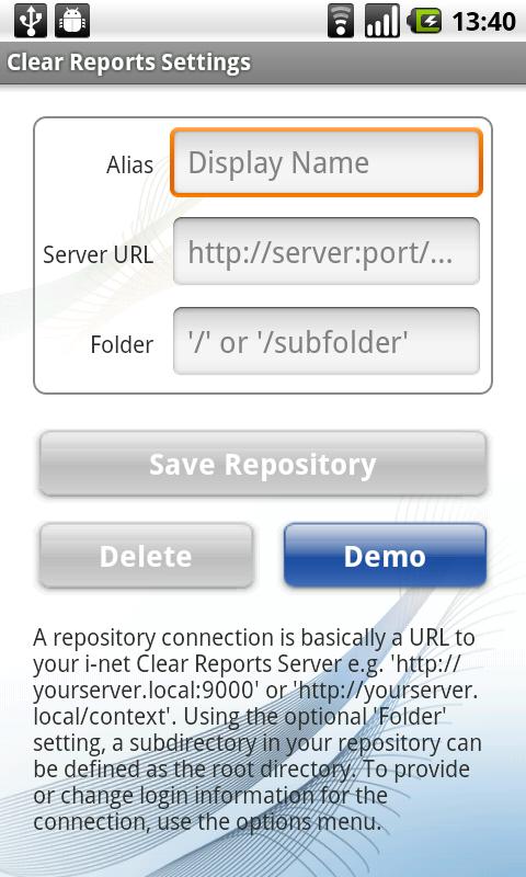 CATATAN: Anda boleh menguji aplikasi tanpa pelayan laporan anda sendiri menggunakan butang "Demo". Ini akan mengakses pelayan demo, tetapi untuk menggunakan sepenuhnya aplikasi ini bersama-sama dengan pelayan Clear Reports i-net anda, diperlukan lesen i-net Clear Reports PLUS. Ciri repositori laporan hanya tersedia dengan lesen ini. Di laman web kami, anda boleh mendapatkan versi percubaan percuma i-net Clear Reports PLUS.