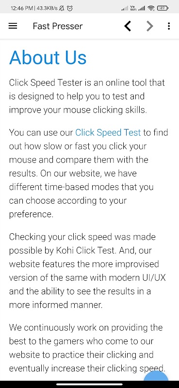 With Fast Presser, check your button pressing speed & see how fast you can tap on your mobile. A simple app to train yourself for fast clicking. It is extremely useful for first person shooting games.
