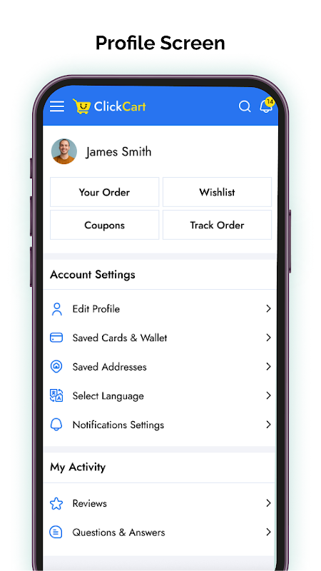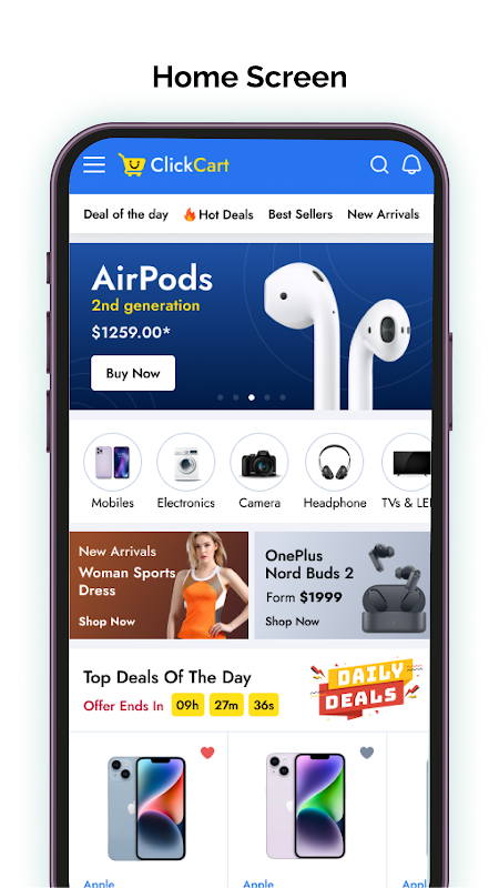 ClickCart - Penyelesaian Templat Aplikasi E-dagang Asli React ialah templat aplikasi E-dagang Berasaskan React Native yang boleh digunakan untuk pembangunan Aplikasi E-dagang.