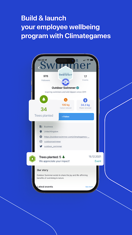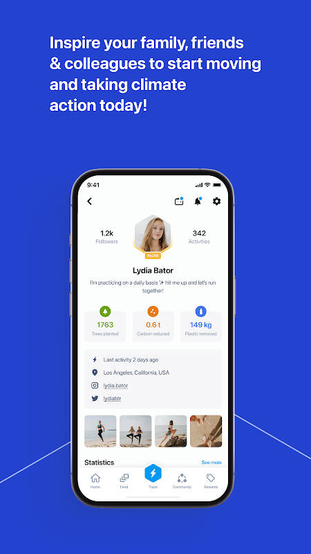 Menggunakan Apl Climategames kami, setiap berenang, berbasikal, berlari atau berjalan boleh menyumbang kepada penanaman pokok, mengalihkan plastik dari lautan atau mengasingkan karbon (& pelepasan gas rumah hijau lain) daripada atmosfera.