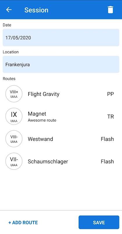 Buku harian pendakian membolehkan anda mengesan sesi pendakian dan laluan yang anda naiki. Anda dapat melihat statistik, mengeksport semua data dalam format .CSV dan banyak lagi.