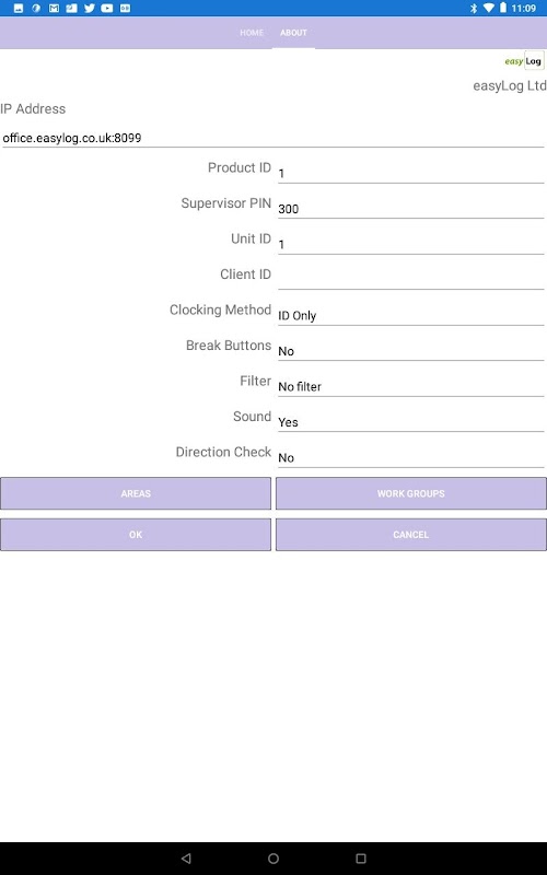 Aplikasi ini akan digunakan pada tablet untuk dinikmati oleh kakitangan di lokasi terpencil. Halaman tetapan mengandungi semua maklumat untuk menyambung ke pelayan jauh dan mengkonfigurasi aplikasi untuk kaedah penentuan jam yang sesuai. Mengklik pada In atau Out atau Break membolehkan tablet memberitahu pelayan jauh bahawa pengguna masuk atau keluar. Pekerja harus memilih nama mereka dari drop-down atau taip ID. Setelah ini dimasukkan pelayan jauh akan mengesahkan nama pengguna jika ada. Menekan butang mengesahkan akan menyelesaikan masa.