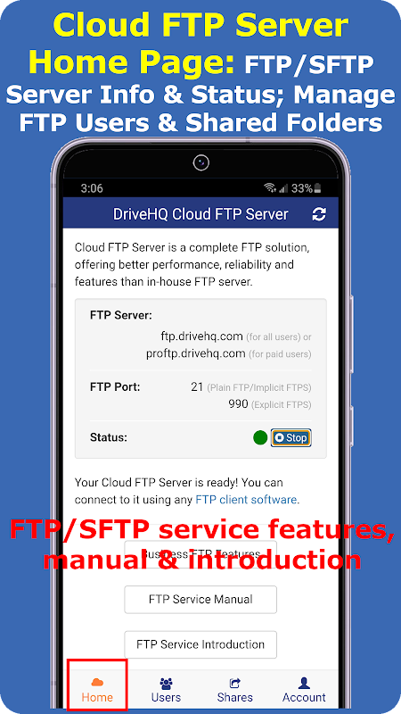 Apl Pelayan FTP Awan DriveHQ menjadikannya amat mudah untuk menyediakan dan mengurus Pelayan FTP Awan anda. Anda boleh mengurus akaun FTP dan hak akses Folder anda dari mana-mana sahaja pada bila-bila masa.