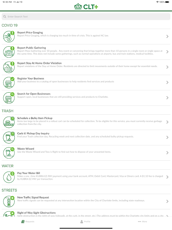 CLT + ialah permintaan perkhidmatan City dan maklumat aplikasi City of Charlotte.