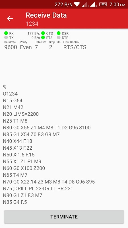 Membenarkan G-Code atau pemindahan data antara sistem kawalan mesin CNC dan peranti Android anda melalui baris bersiri.