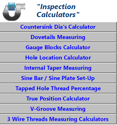 Web Machinist App has many cnc programming calculators for CNC Machinists, Programmers and QC Inspectors. Bolt Circle Calculator, Wheel Bolt Pattern Calculators, Including Calculators for Angles, G code lists, M code lists, CNC Applications, Metal Weight Calculators for both Metric and Imperial calculations, CNC Lathe Fanuc Canned Cycles including G76 Thread Cycle Calculators, Simple Lathe Cam CNC Lathe Tool Nose Compensation G-Code Calculators, metal weight calculator, Chamfer G-Code Calculators, Metric Conversions, Countersink Depth Calculators, Center Drill Depth Calculators, General Conversions, CNC Drilling, CNC Mill & Lathe Deep Hole Drilling calculators, Dovetail Measuring Calculators, Blueprint Symbols, G Codes, M Codes, Machining Formulas and calculators, Spindle speed and feed rate formulas and calculators, circle solving formulas, Hole Patterns, Hole Array Patters including full circle and partial circle patterns, 3 Wire Threads Pitch Diameter Measuring Calculators for Unified Threads, Metric Threads, Acme Threads and Metric Trapezoidal Threads, CNC Lathe Tool Nose Radius compensation calculators, QC Inspection, Manual Machining, Metal Removal Rates, CNC Milling, Reference, Rotary Axis, Speeds & Feeds, Imperial and Module Spur Gear Dimensions Calculators, CNC Tapping, CNC Threading, Manual Lathe Calculators, Unified Threads, Metric Threads, Acme Threads, Metric Trapezoidal Threads, Spur Gears, Module Spur Gears, Imperial Spur Gears, Area Calculators, Triangles, Circle Calculators, Mill Machine Tooling, Collets dimensions, Keyseat Cutters Calculators, Trigonometry Calculators, Hole Pattern Calculators, Wheel Bolt Pattern Calculators, Manual Mill Calculators, Tooling & Hardware, Sine Bar and Compound Sine Plate calculators, Trigonometry & Geometry, circle calculator, Shop Math Calculators, Lathe Spindle Speed Calculators, CNC Tapping Speeds Calculators, Surface Roughness Calculators, Drilling Speeds Calculators, Tapping Speeds Calculators, CNC Turning and Miscellaneous Calculators. This is a Must Have Program for Machinists, CNC Machinists, Machine Shops, QC Inspectors, CNC Set-up Operators, CNC Programmers.