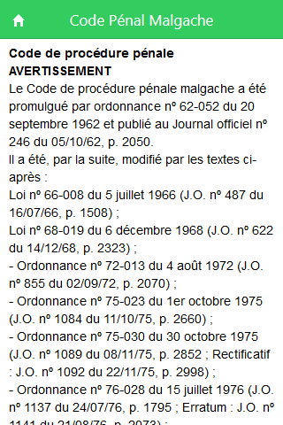 Le Code de procédure pénale malgache a été promulgué par ordonnance nº 62-052 du 20 septembre 1962 et publié au Journal officiel nº 246 du 05/10/62, p. 2050.