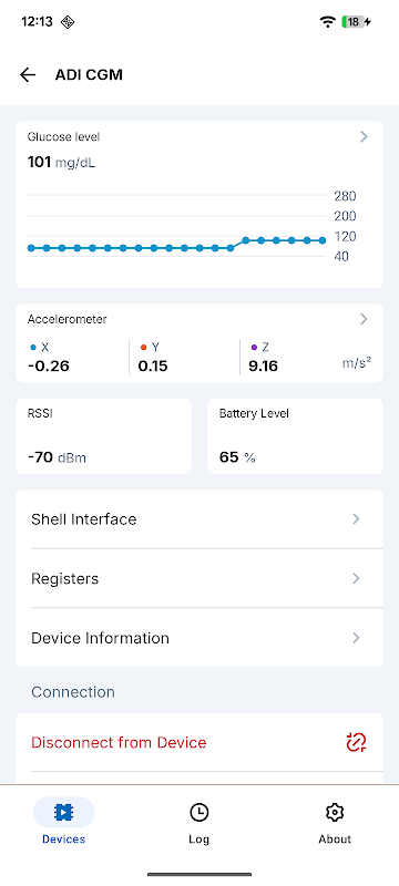 Aplikasi ini membolehkan pengimbasan, menyambung ke dan berinteraksi dengan perkhidmatan Bluetooth papan, termasuk sokongan untuk data CGM, bacaan pecutan, antara muka Zephyr Shell, daftar peranti, kemas kini melalui udara (OTA) dan diagnostik.