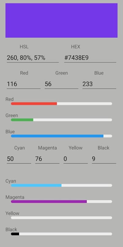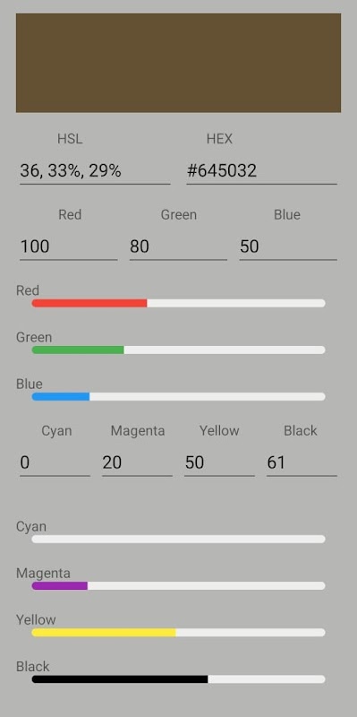 Tukar dan segerakkan antara kod warna RGB, HEX, CMYK dan HSL dengan mudah dengan peluncur masa nyata dan medan input boleh diedit. Sama ada anda mencipta reka bentuk digital, membangunkan tapak web atau memilih warna jenama, apl ini menjadikan manipulasi warna mudah, pantas dan tepat.