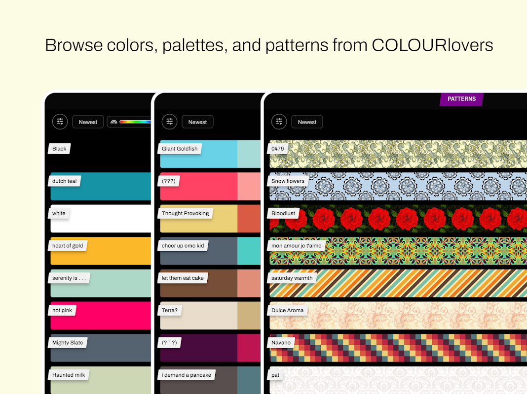 - Profil Komuniti: Terokai profil pengguna dan temui ciptaan daripada ahli komuniti COLOURlovers yang berbakat.