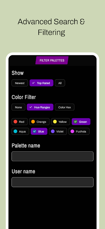 - Teroka Palet: Akses palet warna dipilih susun dengan pilihan penapisan lanjutan. Lihat gubahan palet, salin warna individu dan cari kombinasi warna yang sempurna.