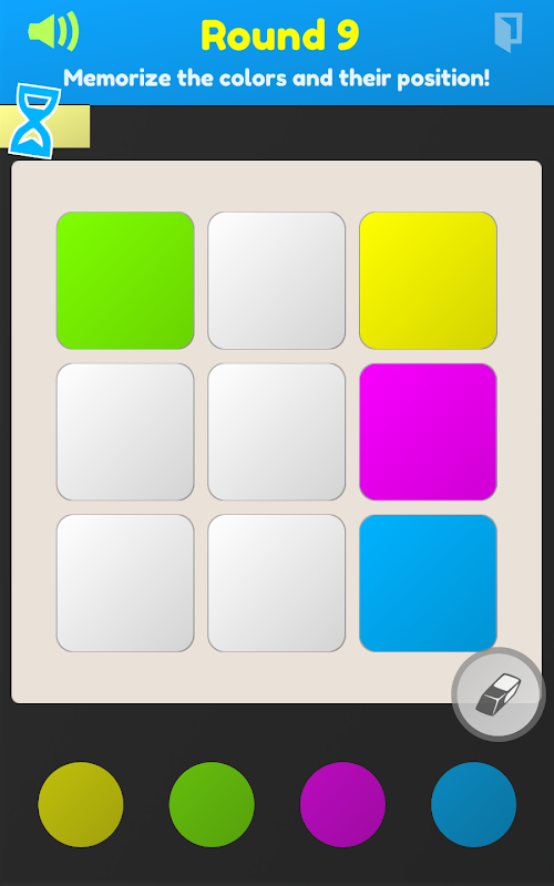 In this grid of squares you will need to memorize the colored squares and their position in the grid before the time runs out, where the grid will switch back to blank tiles. If you guess correctly, you will move on to the next round. If you fail your guess, the game is over.