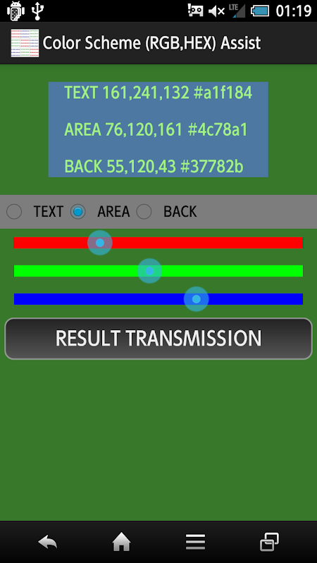 You can get RGB values and the hexadecimal, Easily operation of the seek bar, there further also can function to be sent to the application, such as RGB values and the hexadecimal mail.