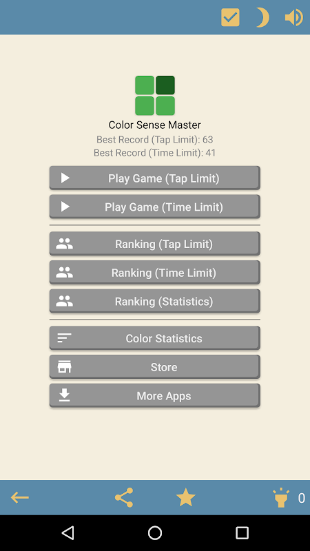 Menu 'Statistik' memaparkan skor persepsi warna kumulatif pengguna, yang berdasarkan permainan keseluruhan permainan pengguna.