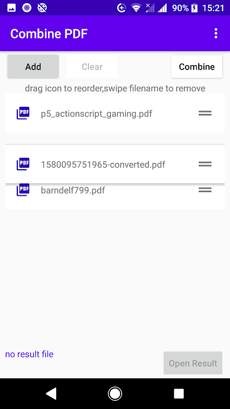 2.You can reorder PDF files with drag icon and you can remove PDF files with swipe to right