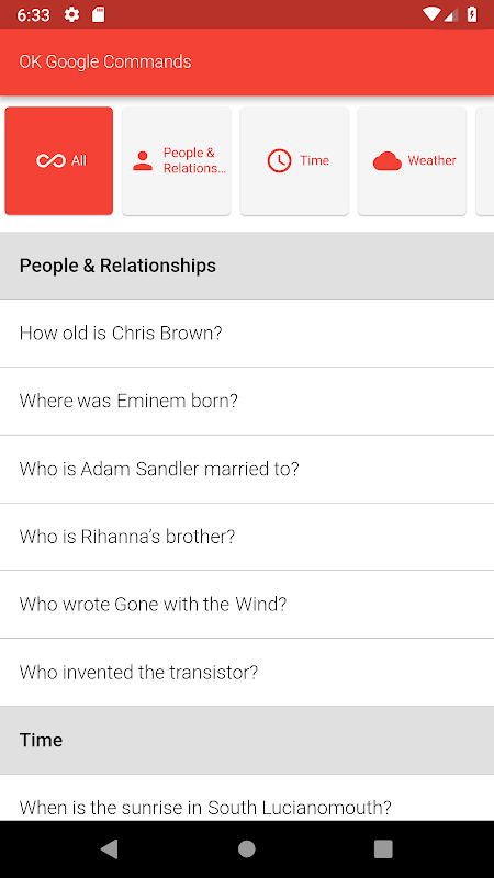 This is an extensive list of more than 150 commands for Google's voice assistant. Commands can be viewed as a one holistic list or sorted into 25 different categories. Here is the list of all categories the commands are sorted into