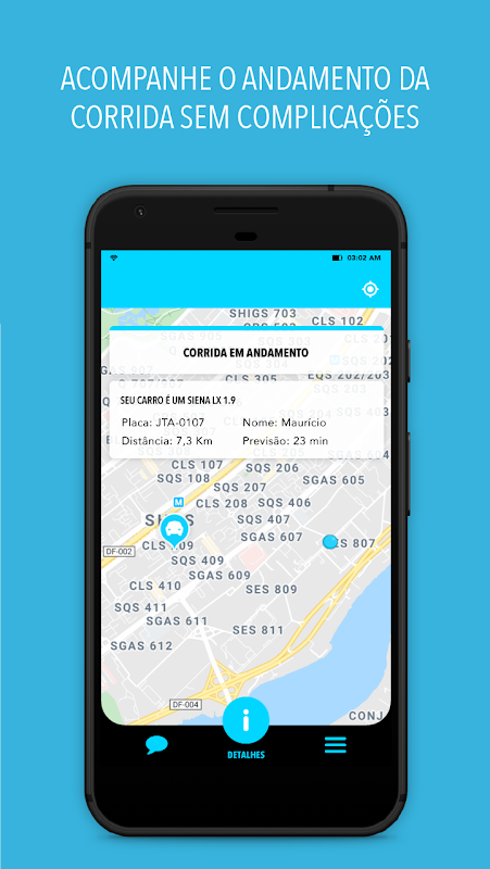 Nosso aplicativo permite que você chame um de nossos veículos e acompanhe o deslocamento do carro no mapa, sendo avisado quando ele estiver na sua porta.